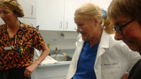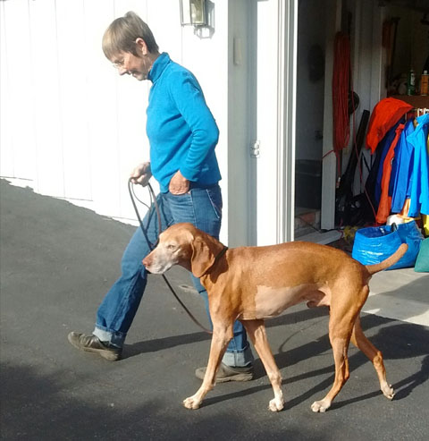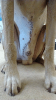 | The first photo above is of Dr. Metalman, who did the surgery on Buzz. She said that she'd "done exploratory surgery before, but nothing like this!" She was able to remove a 5 pound mass from his abdomen, but she cautioned us that the cancer had almost certainly spread. The second photo is Buzz leaving the surgery center two days after the operation. The third photo are his stitches. |