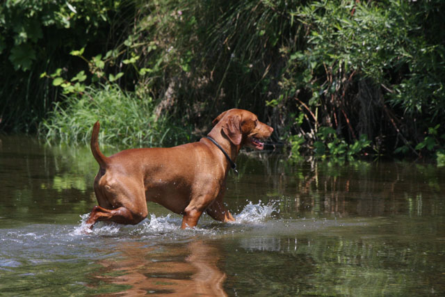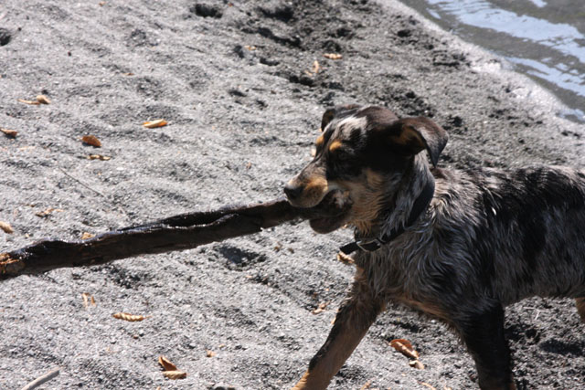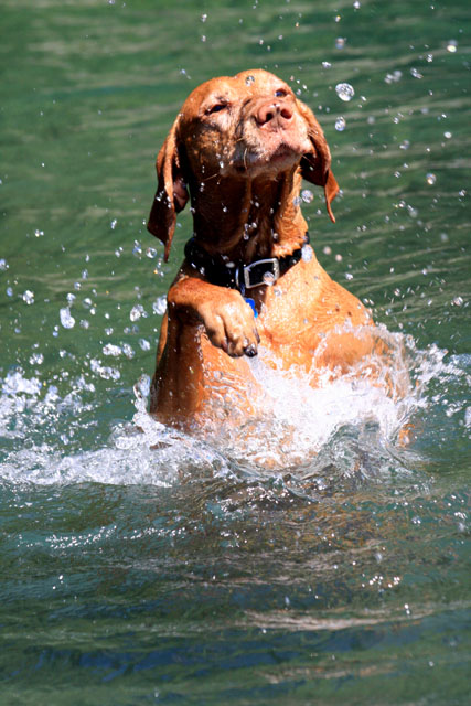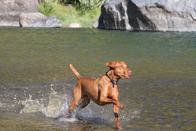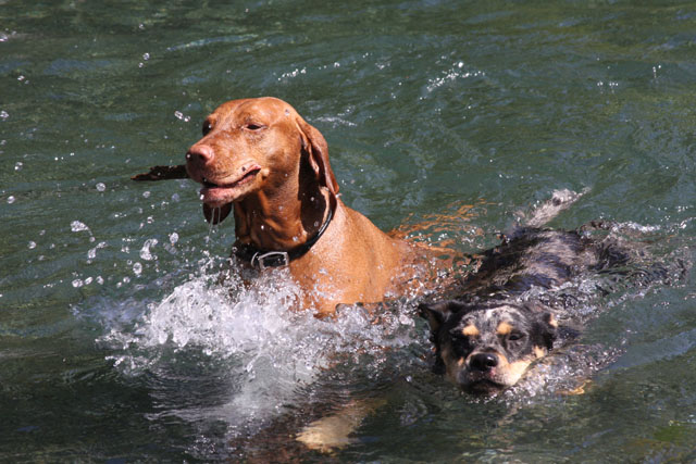 My friend Cory has a beautiful home in Hyampom, a tiny town about midway between Red Bluff and Willets, in Nor Cal. We mostly go up to have an All Girls' Horsey Vacation, but Buzz has come along a few times. Buzz has a buddy up there: Boo, Cory's female dog. Buzz met Boo when she was just a few weeks old (she was abandoned at three weeks!) and they've kept up their relationship. They play around the yard, but more significantly, Hyampom is where Buzz learned how fun water can be. He was driven into the water by the heat, but he quickly learned that most games that can be played on land can be played at sea.