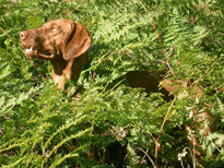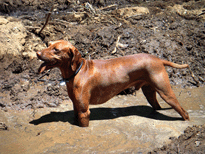 | When Buzz had been there a couple of years, though, Toby arrived on the scene. B and D weren't willing to walk out with us, but Toby was ready for anything. The adventure the pictures are documenting is a hike we took to see what damage the Martin Fire had done in upper Bonny Doon. It was awfully hot and the fire lanes that Cal Fire had made had been drenched - as to actually retard the fire, so both Buzz and Toby took full advantage of the opportunity. It took us weeks to get Buzz clean, even with his (heh heh) Buzz cut hair. |
