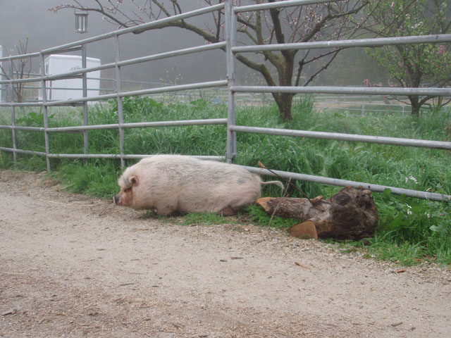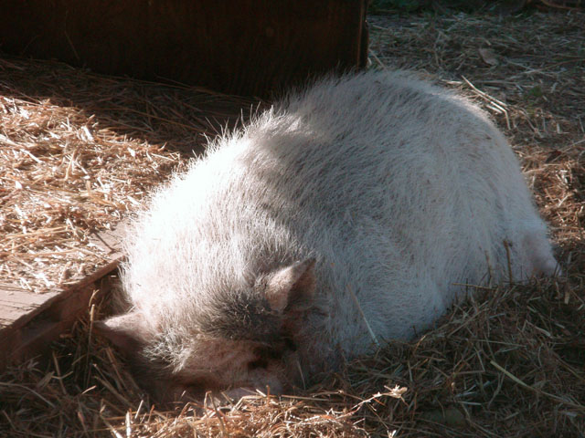 | And then there's Ivy. Ivy was a pig who loved to escape her pen, walk . . . 10 feet and lie down. Buzz and I would sometimes feed the horses in the evening and find Ivy out and we had to herd her back into her pen. Sheesh. |