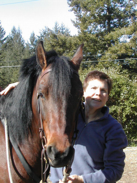 After we crossed Empire Grade, the plan was to take the UC fire roads to Pogonip and UCONN, cross Highway 9 and follow the trail to the San Lorenzo river. As you can see, we made it, but it was not without adventure. First, Debbie decided that Alex was going to learn to love cyclists, so every time she saw one (and she saw lots of them), she gave them a horse treat to give to Alex. It didn't take long for Alex to stop and mug every cyclist he saw. At least one nice young guy stopped to count his fingers after he'd done his part to train Alex. Second, another of those things that Alex took a conservative equine approach to was utility service access points - the concrete panels set in the road, with metal plates that lift off for maintenance. There are probably ten of those set in Chinquapen and Alex hopped at every one he noticed.