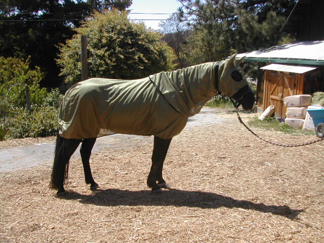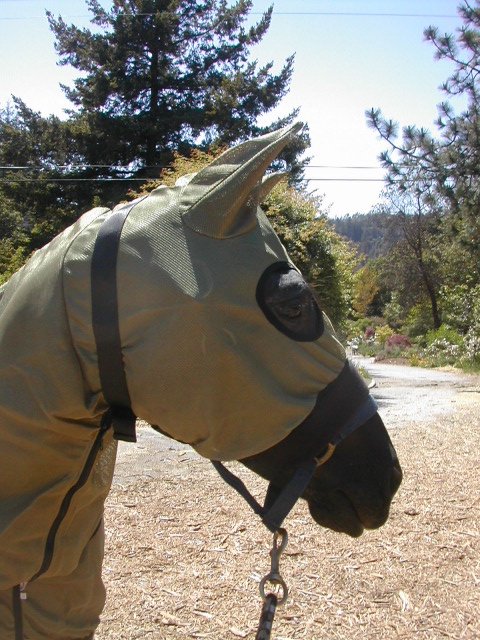 The fly season has hit here in Bonny Doon and Tuffy is allergic to them, so his Mom got him a fly suit. Bonnie pointed out that The Tufster looks sort of medieval, with his armor on. Hmmm. It looks to me a lot like the Chemical and Biological Warfare Safe Suits we saw on tv recently - do they know something we don't know?
