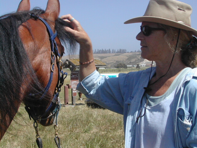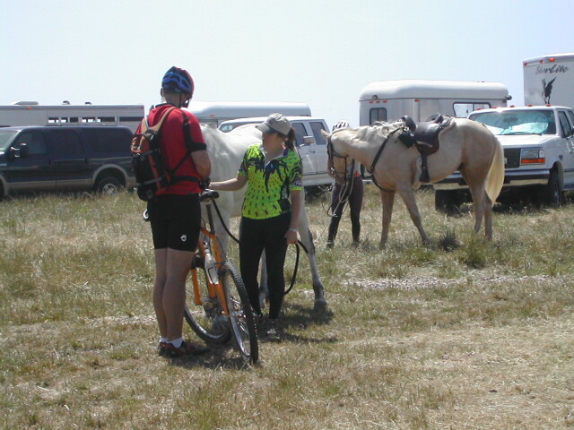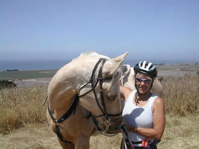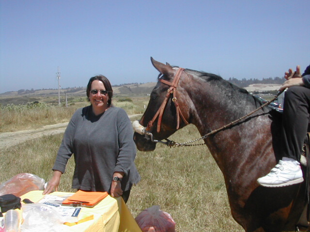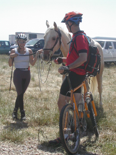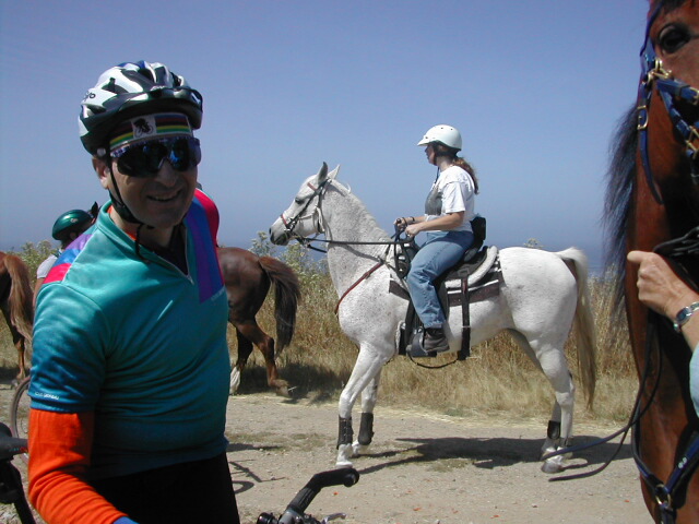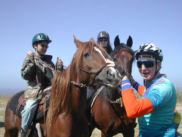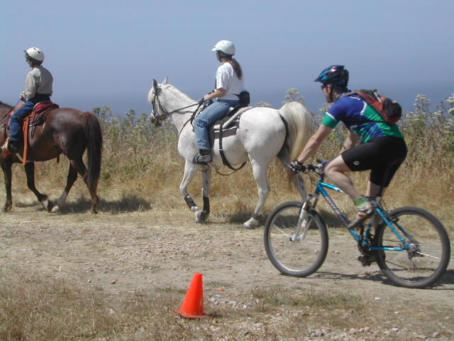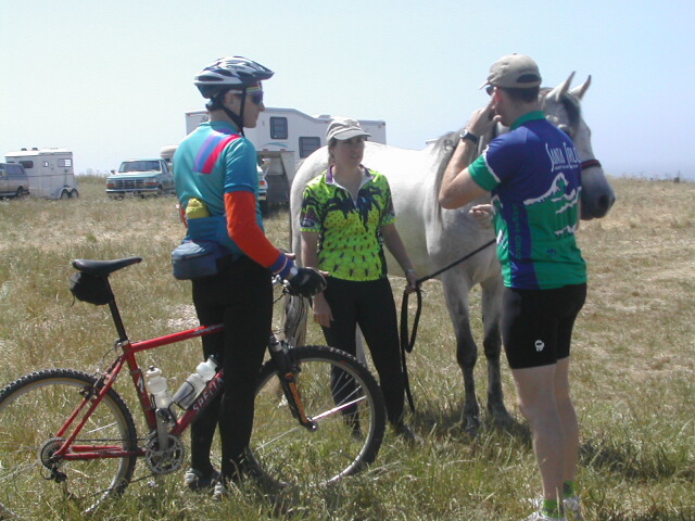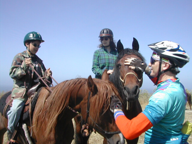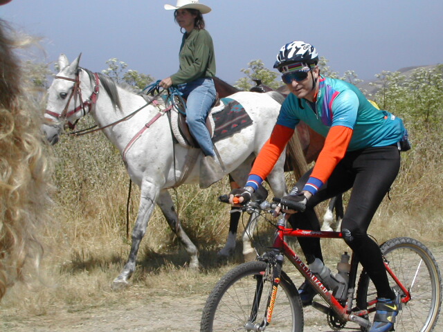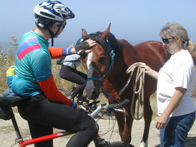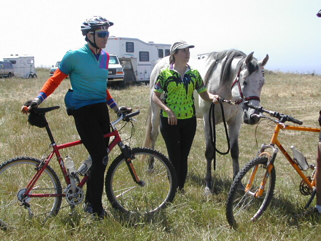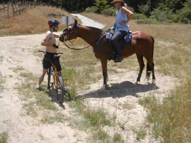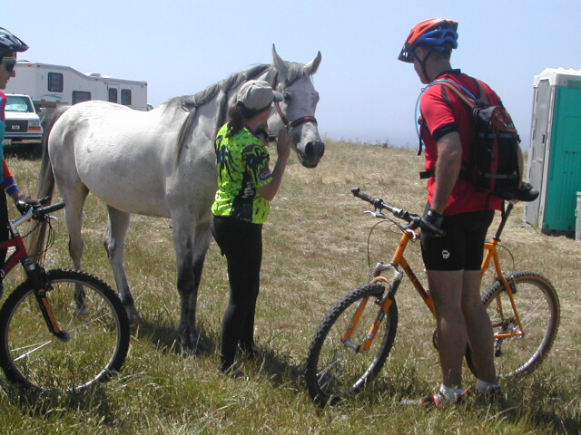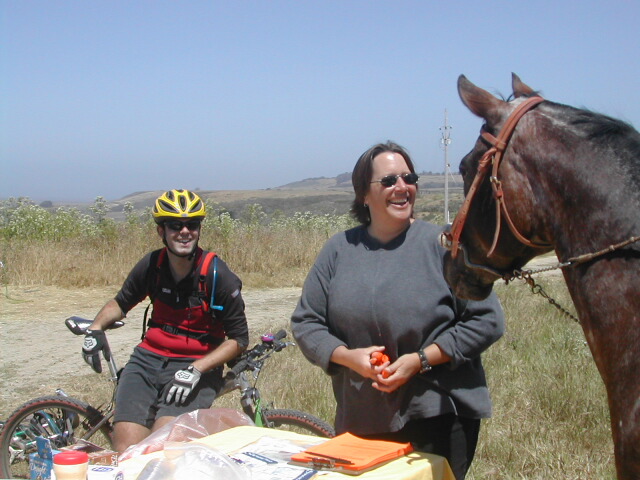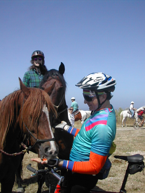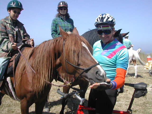 The Carrotfest is an annual event put on by the Santa Cruz Horsemen's Association and the Mountain Bikers of Santa Cruz. Members from both clubs meet at the Horsesmen's camping site on Hwy 1, bringing along their respective steeds, and the bikers work with the horses and horseman to accustom the horses to meeting bikes on the trail. The two main co-conspirators are in the picture above - the organizers from the two participating clubs, and Teddy Bear, the horse.