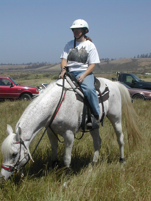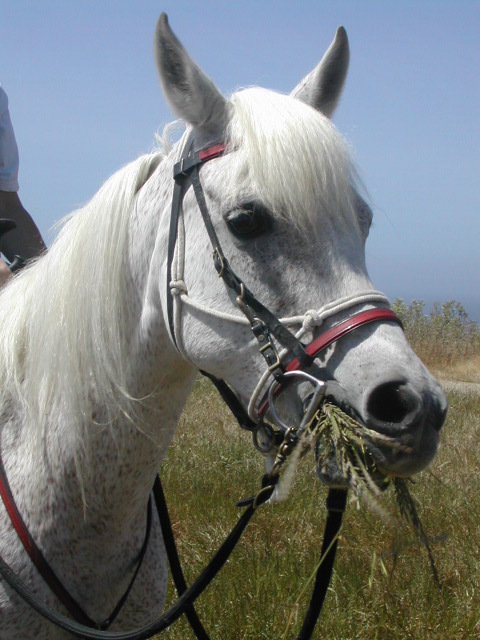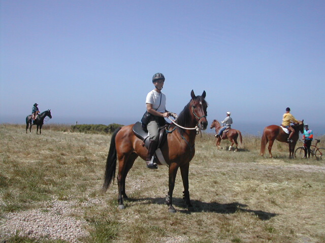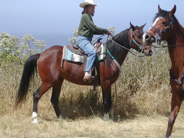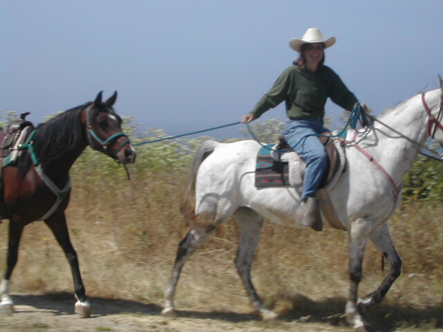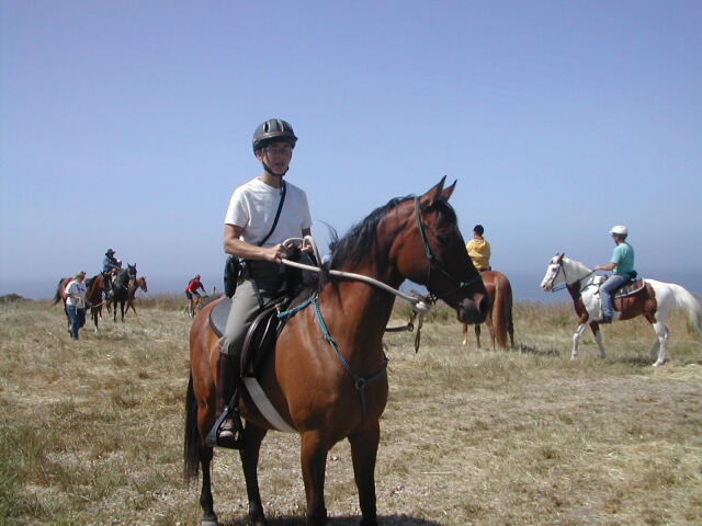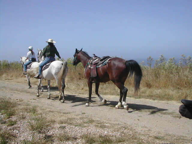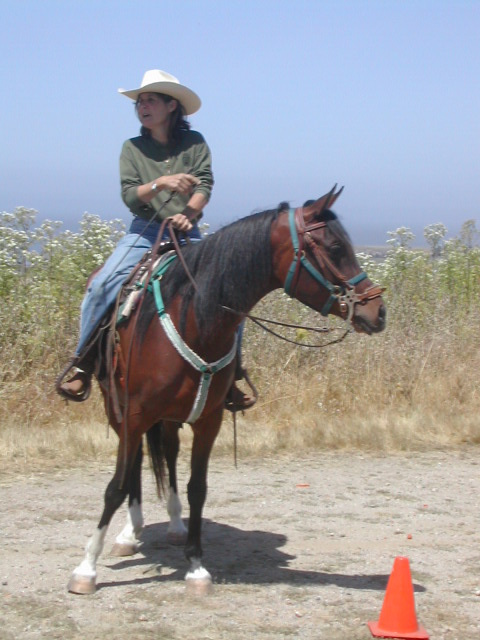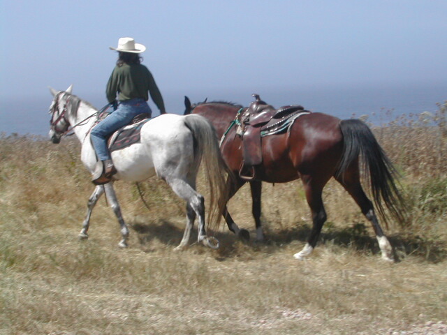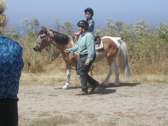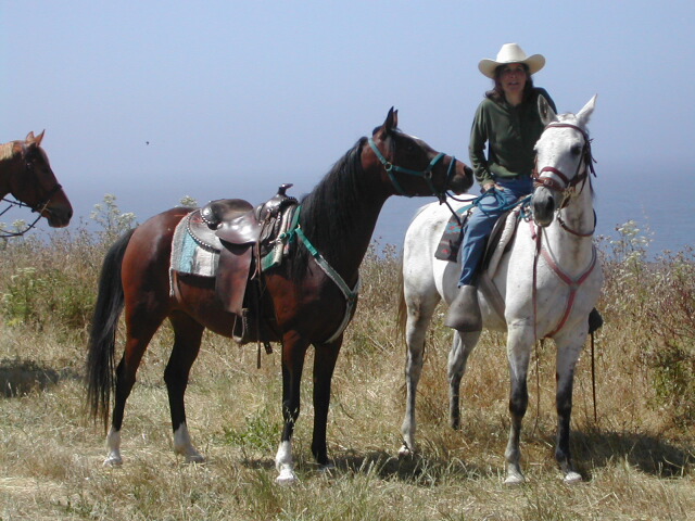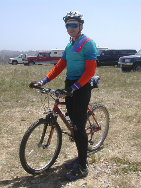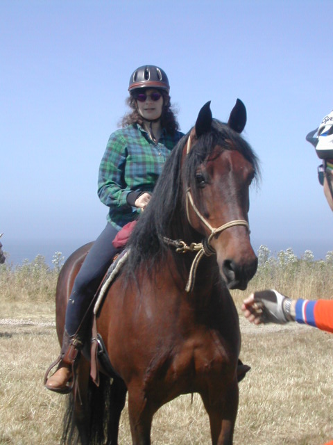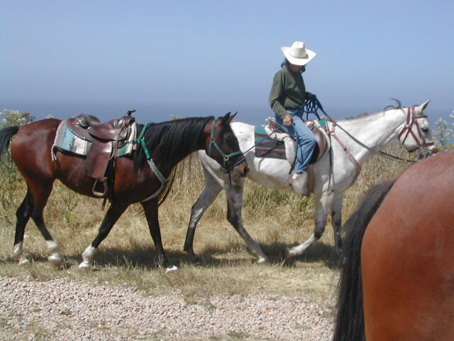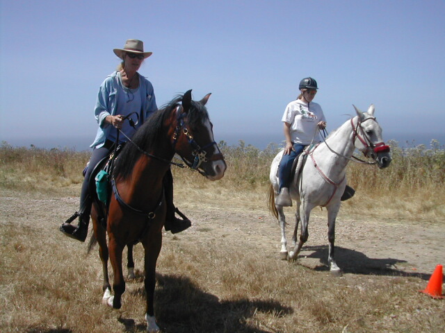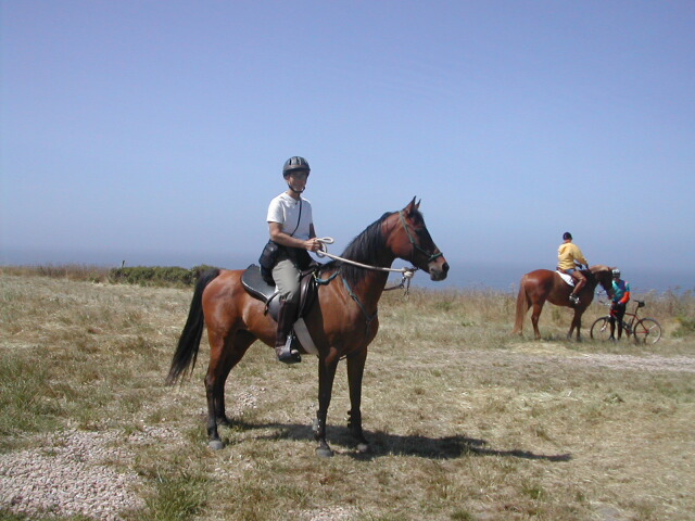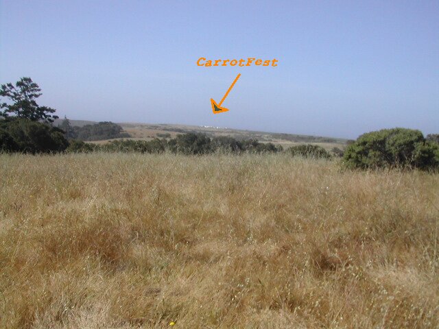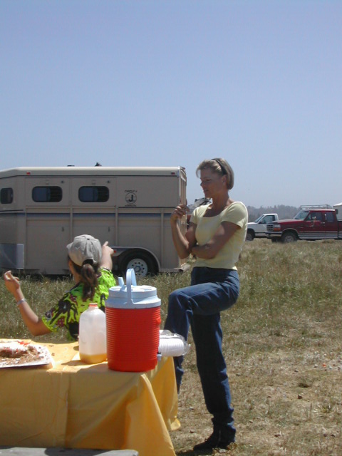 The Carrotfest is an annual event put on by the Santa Cruz Horsemen's Association and the Mountain Bikers of Santa Cruz. Members from both clubs meet at the Horsesmen's camping site on Hwy 1, bringing along their respective steeds, and the bikers work with the horses and horseman to accustom the horses to meeting bikes on the trail. The two main co-conspirators are in the picture above - the organizers from the two participating clubs, and Teddy Bear, the horse.