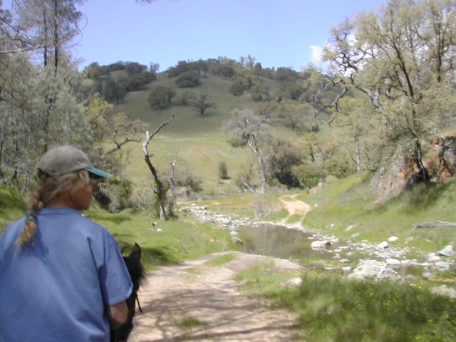 After quite awhile on the single track, we emerged into a valley with a river running through it. It was very beautiful as it unfolded from behind Judy's shirt. All the horses took the opportunity to drink and Nancy's horse, Tonto, looked like he was contemplating rolling, too.