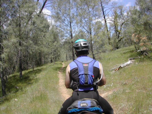 The fire road ended when we got to the ridge top and saw what has to be the outhouse with the best view in Central California - it's the little white building in the distance. When we got there, we headed down some seriously single singletrack.