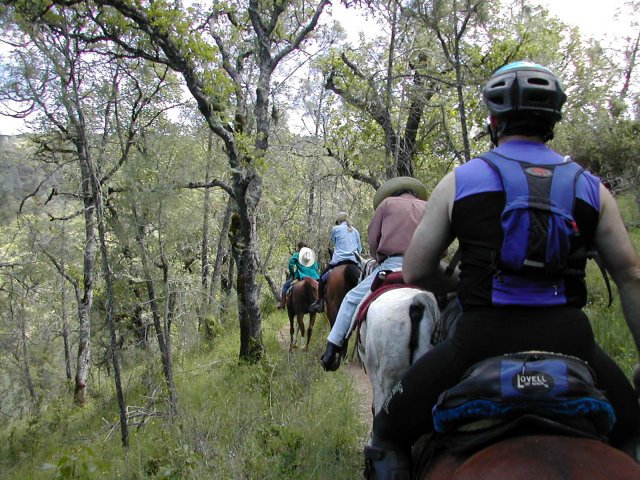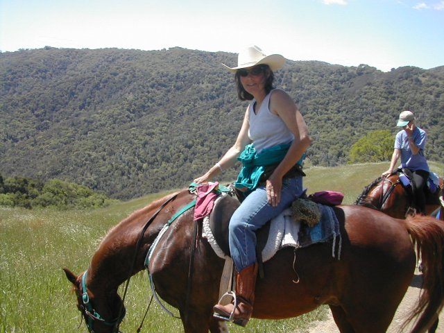 We followed the stream for quite a while, then broke off and started our long singletrack climb to the ridgetop. Half way up, we found a picturesque and almost flat place to give the horses a breather and grab a bite of lunch for ourselves. It wasn't too long before Nancy mounted up, though, and got us dogies rollin'.