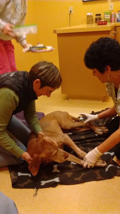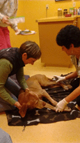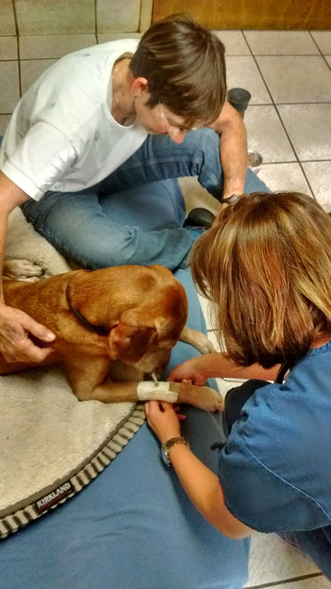 | These photos are of Buzz getting chemotherapy. The drug is selected not only for its strength, but for its requirements for the dog - as in, if the dog has to be stationary for 3 hours to get it, it's probably not going to work out for some dogs. The idea is to strike a balance between the efficacy of the drug and the emotional comfort of the dog. I found all the vets and techs involved in Buzz's treatment totally admirable and empathetic. |