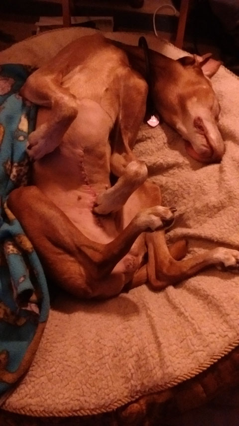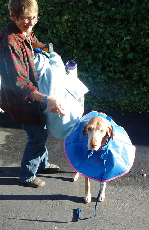 | The first photo above is of Dr. Metalman, who did the surgery on Buzz. She said that she'd "done exploratory surgery before, but nothing like this!" She was able to remove a 5 pound mass from his abdomen, but she cautioned us that the cancer had almost certainly spread. The second photo is Buzz leaving the surgery center two days after the operation. The third photo are his stitches. |