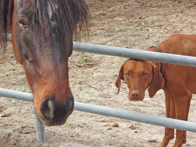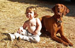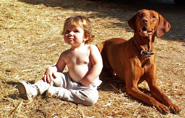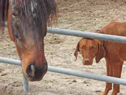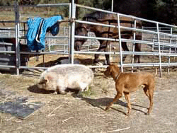 Here's Zeph and Buzz trying to herd Ivy, the pig back to her pen. Sometimes when the Robinsons went traveling, which was fairly often, I'd get tapped to feed the horses and Buzz would come along, of course. Ivy was the best escape artist I've ever run into. She didn't seem to have any particular goal in mind except to get out of her pen. She'd get out and walk over to some horse's paddock and just lay down in front of it and wait for me to try to move her. Buzz would help as much as he could, but Ivy was NOT impressed by his Viszla aura. Lots more on this and the buddies above on the Robinson Ranch page. |