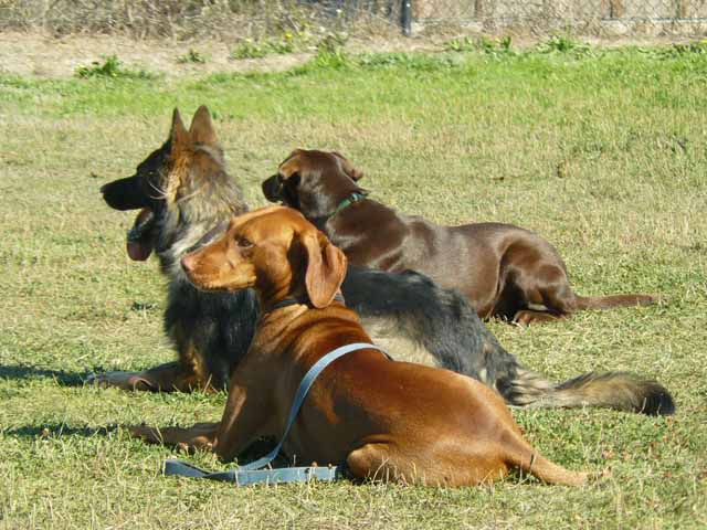 And here he is with his posse from "obedience" school. I put "obedience" in quotes because it was run by a local vet, Jan Brennan, who also sat (and still is on, I think) the Homeland Security panel, as the expert on search and rescue dogs, which were her passion. Sooo, when you started with Jan, you and your dog went through the basic socialization class, then classic obedience, then it got fun - she had the dogs doing things like jumping up on 2 x 4s suspended on barrels, then sitting down and waiting for directions from there. Or having tree climbing contests. This group of three dogs were regulars with Jan for several years. More on this on the Dog School page.