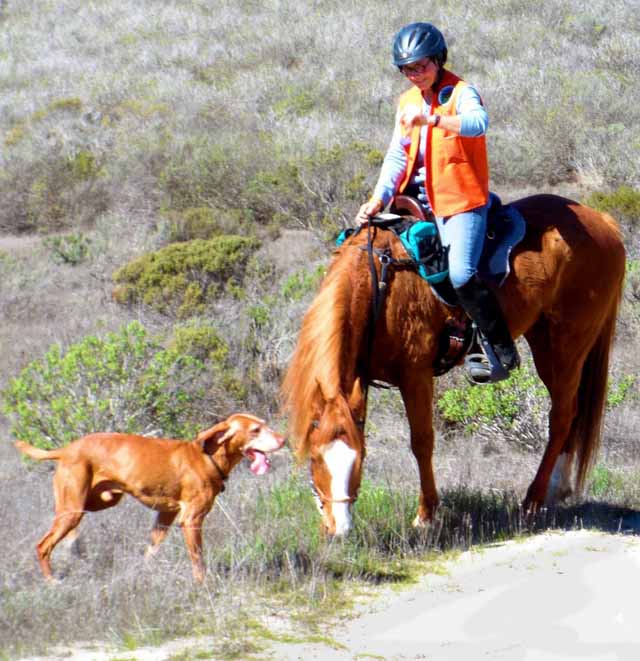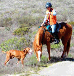 The next couple of pictures are of Buzz, Sunny (the cranky mare), and me at Fort Ord. Until recently, it was okay to have dogs off leash in Ft Ord, so Buzz would come along with Sunny and me when we rode out there. It was pretty funny: after the first . . . 500 yards, Sunny decided Buzz was part of her herd. When he would pass her, she would relax, as horses do when someone else takes over the lead. When he would get behind (you know, stopping to water a bush or something), she'd go back on high alert. A zillion pics of Buzz at Ft Ord, with and without Sunny, at the Ft Ord page.