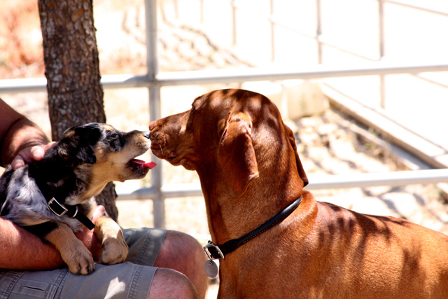 Buzz is checking in with Boo, my friend Cory's dog. Boo was rescued from being drowned at the age of 4 weeks - her upbringing was about as opposite from Buzz as it could be. Boo and Buzz enjoy swimming in the Trinity River together. You can see Buzz figuring out how to swim on the Hyampom page.