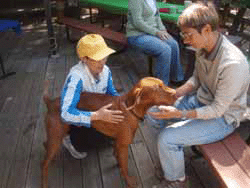 Here's Buzz and a Chinese colleague of mine. She hadn't ever been around a large dog before so Buzz was her first exposure. She was impressed.
