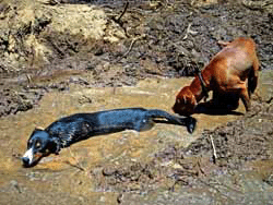 This is Toby, the Ranch Dog, who was probably Buzz's first serious pal. This photo was taken after the Lockheed Fire in . . . 2009(?) During the fire, Cal Fire brought in heavy equipment to make fire breaks, then ran water through it. After the fire, Toby, Buzz and I took a hike up to see what the fire had done. The dogs got hot, so Toby jumped into one of the mud puddles and Buzz followed.
