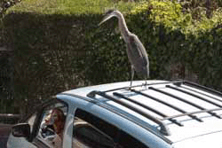 I just had to include this photo because it's so weird. Buzz and Wayne went out to Wayne's van to go for a walk a few months ago, and found this bird on top of the van. And he wouldn't leave. Even with Buzz hanging his head out the door, the bird hung around for about half an hour!