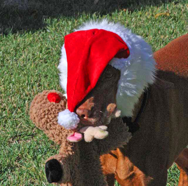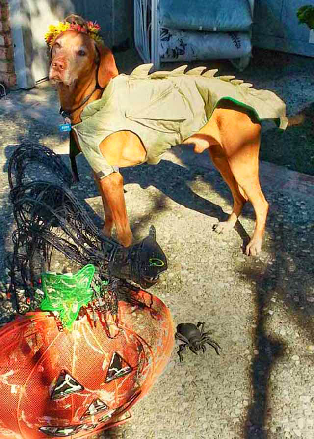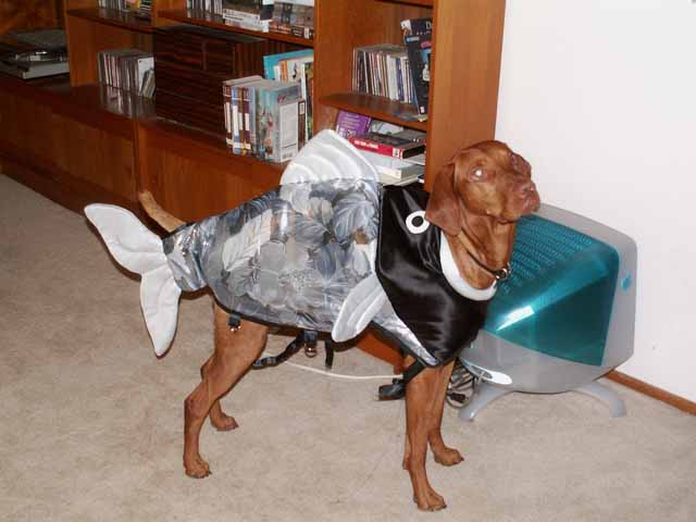 This might have been the highlight of Buzz's dress-up career. You probably can't tell from the photo, but it was an iridescent fish costume, complete with a tail that went over HIS tail, so when he wagged his tail, the fish tail wagged, too. We made him wear it to dog school and he scared all his buddies - they'd have nothing to do with him. |