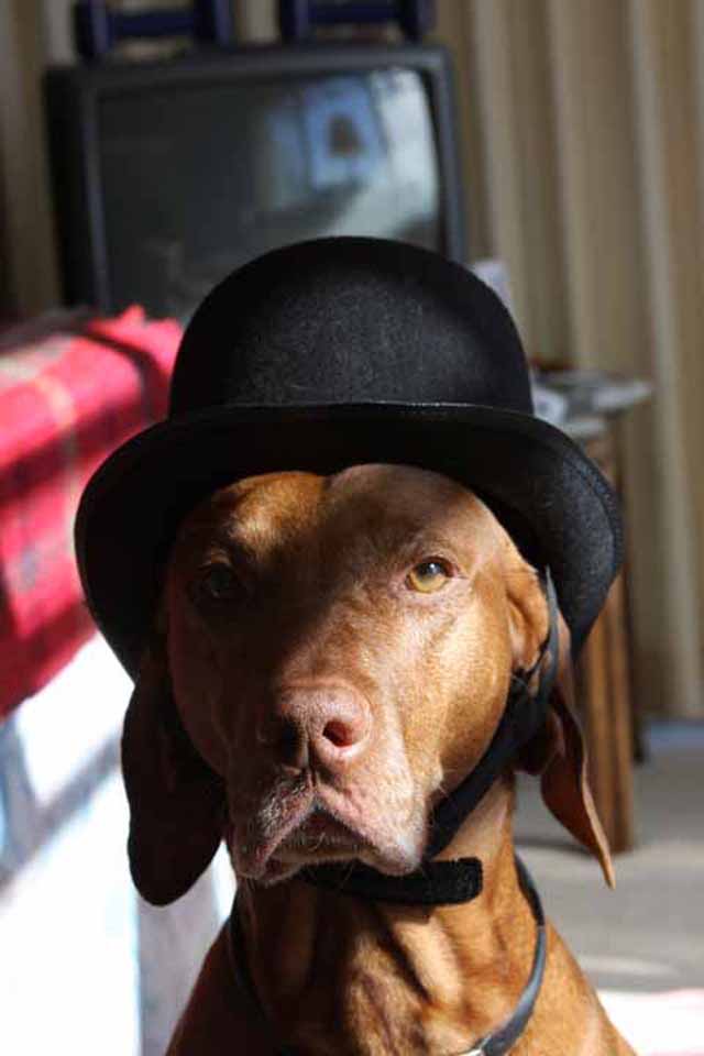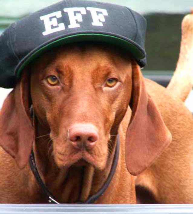The next two photos are our lame efforts at dressing him up. This one is Buzz wearing his Electronic Freedom Foundation hat, although he was pretty apolitical, usually. |