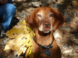 I don't remember why, but we stuffed these Autumn leaves in his collar and made him parade around that way. Buzz was an infinitely tolerant dog. |