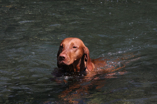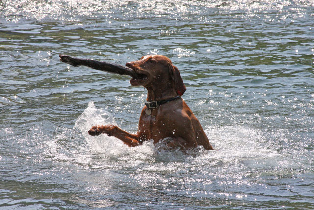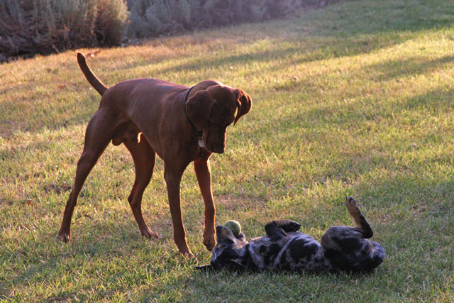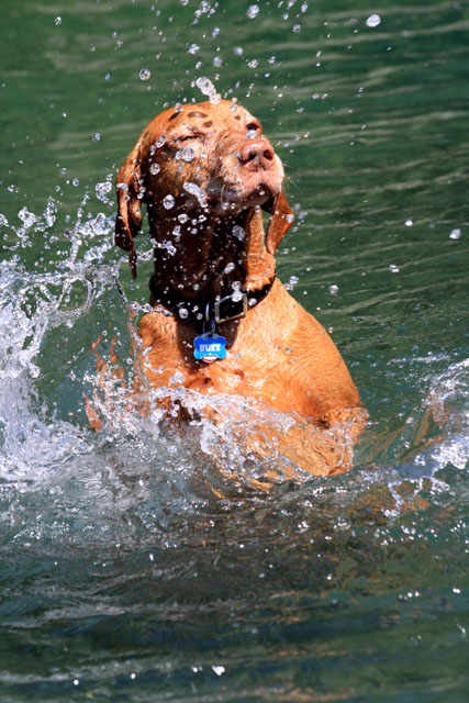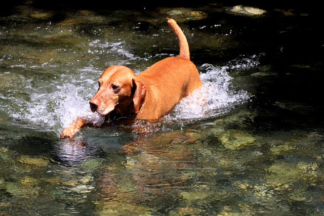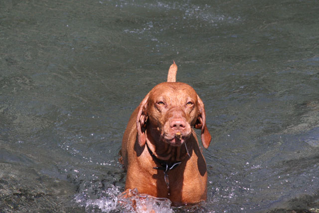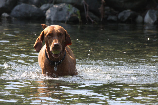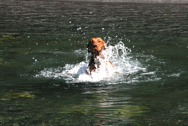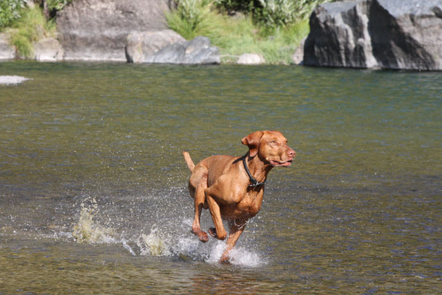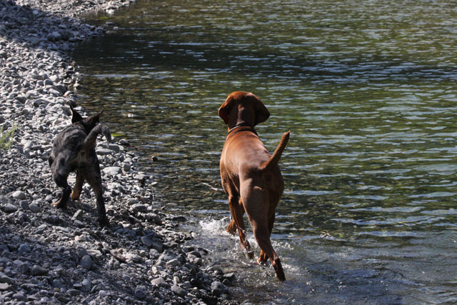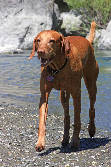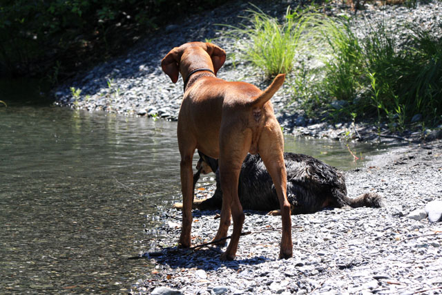 My friend Cory has a beautiful home in Hyampom, a tiny town about midway between Red Bluff and Willets, in Nor Cal. We mostly go up to have an All Girls' Horsey Vacation, but Buzz has come along a few times. Buzz has a buddy up there: Boo, Cory's female dog. Buzz met Boo when she was just a few weeks old (she was abandoned at three weeks!) and they've kept up their relationship. They play around the yard, but more significantly, Hyampom is where Buzz learned how fun water can be. He was driven into the water by the heat, but he quickly learned that most games that can be played on land can be played at sea.