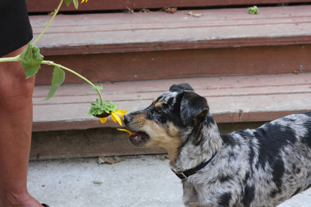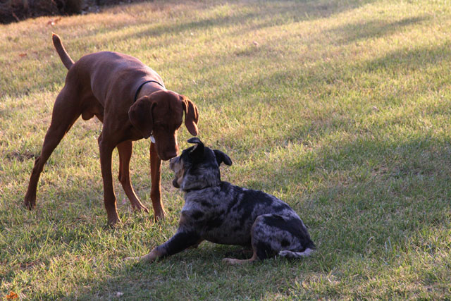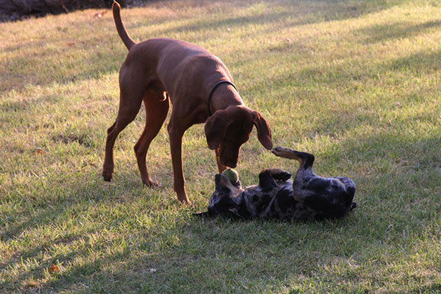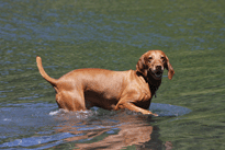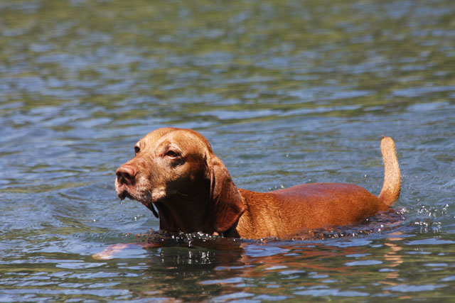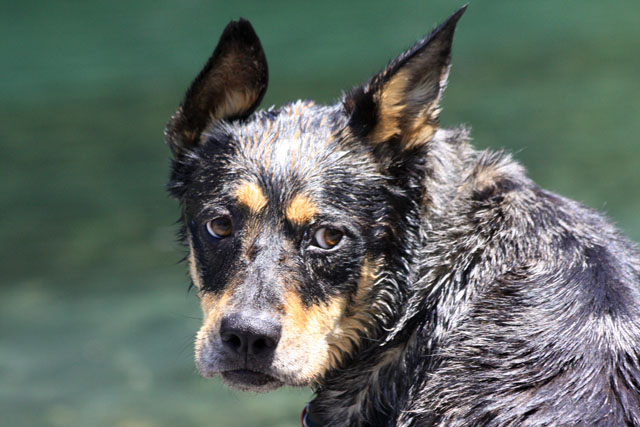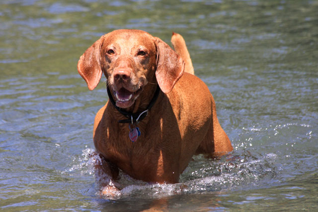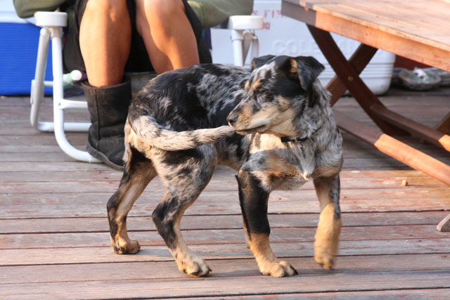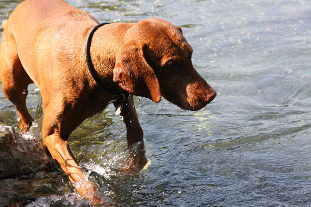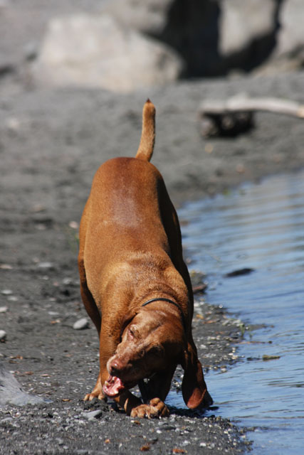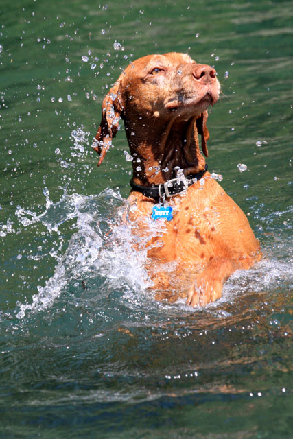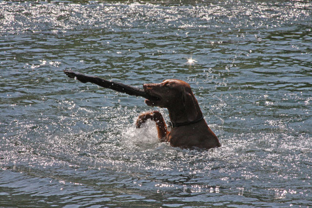 My friend Cory has a beautiful home in Hyampom, a tiny town about midway between Red Bluff and Willets, in Nor Cal. We mostly go up to have an All Girls' Horsey Vacation, but Buzz has come along a few times. Buzz has a buddy up there: Boo, Cory's female dog. Buzz met Boo when she was just a few weeks old (she was abandoned at three weeks!) and they've kept up their relationship. They play around the yard, but more significantly, Hyampom is where Buzz learned how fun water can be. He was driven into the water by the heat, but he quickly learned that most games that can be played on land can be played at sea.