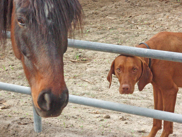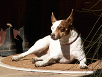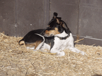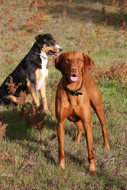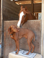 | As soon as Buzz had his shots and was cleared to go out in the universe, I started taking him to Robinson Ranch, where I kept my horse. I attribute a lot of Buzz's zen personality to having his first independent adventures there. Maybe the best thing about The Ranch was the friends he made. His first buddies were Bonny and Doon, the Ranch owners dogs. They ran him around like the terr(i)ors they were! |