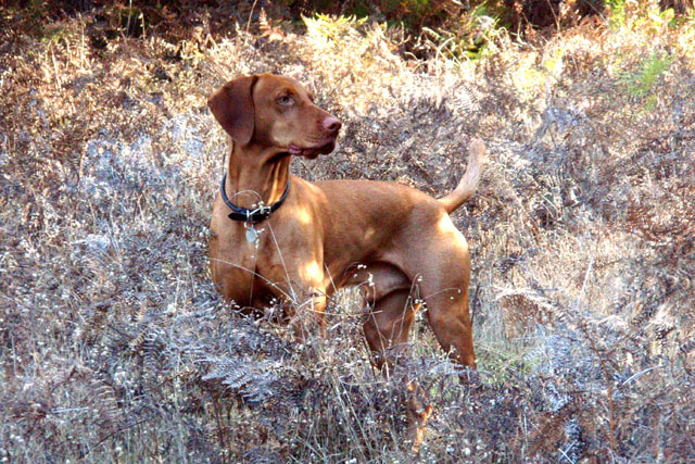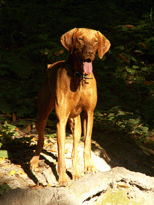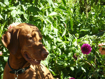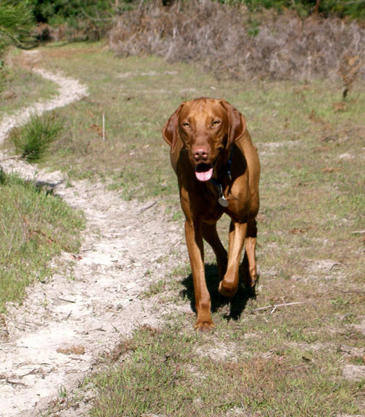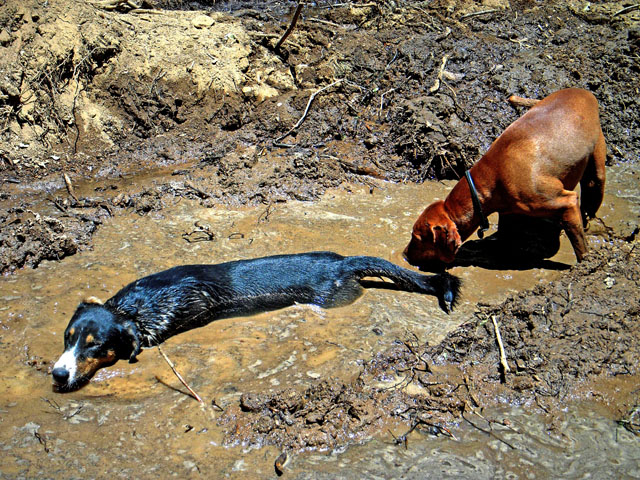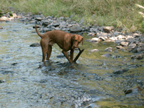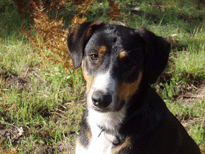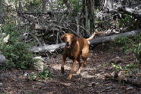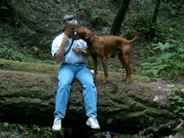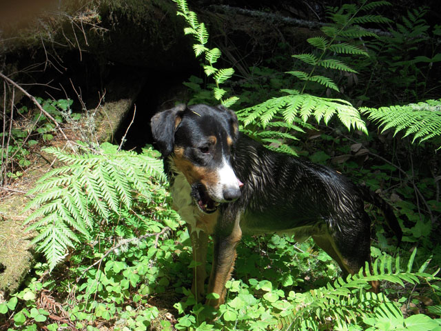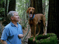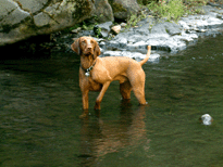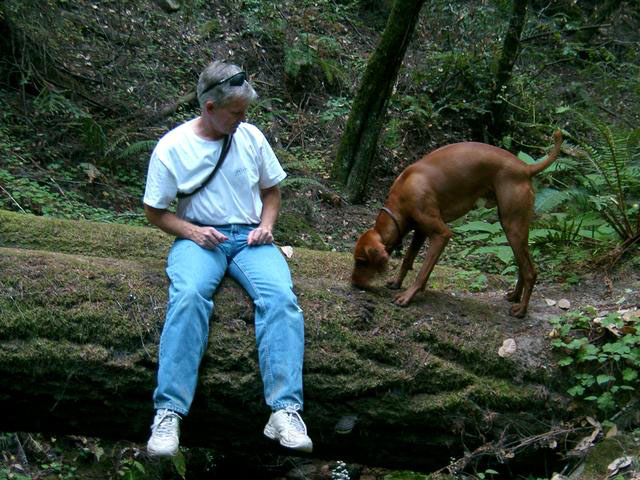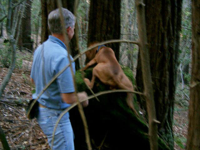 | When Buzz had been there a couple of years, though, Toby arrived on the scene. B and D weren't willing to walk out with us, but Toby was ready for anything. The adventure the pictures are documenting is a hike we took to see what damage the Martin Fire had done in upper Bonny Doon. It was awfully hot and the fire lanes that Cal Fire had made had been drenched - as to actually retard the fire, so both Buzz and Toby took full advantage of the opportunity. It took us weeks to get Buzz clean, even with his (heh heh) Buzz cut hair. |