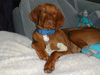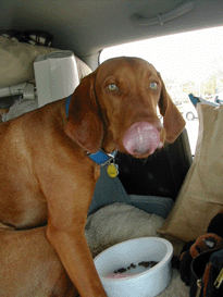 Shameless and Jerry were at the front door each morning at 6:30, and they left to go get dinner at home, about 6:30 PM. According to report, neither of them moved apres dinner - and we're sure Buzz didn't. In point of fact, the only time he roused himself on the 17 hour drive home was to slurp up this strawberry milkshake Wayne bought him. I was trying to get his strawberry pink nose, but I got this powerful picture of a Vizsla tongue instead. |