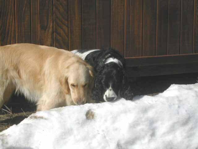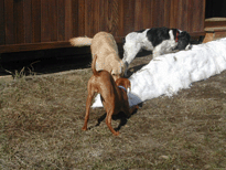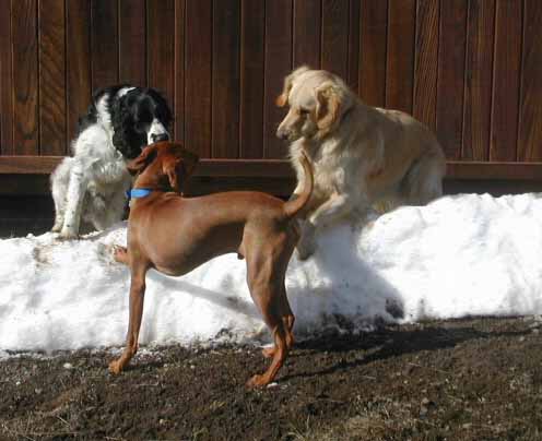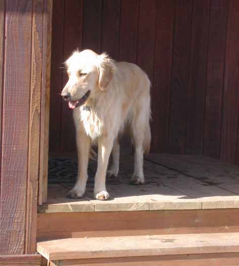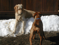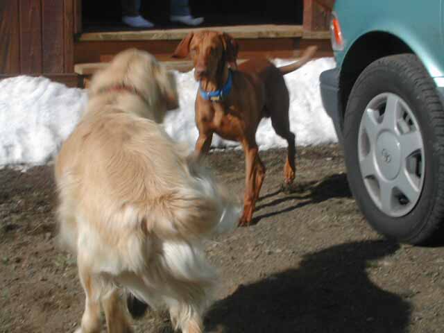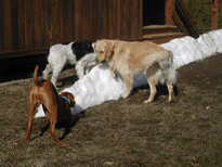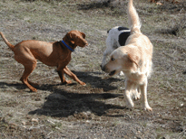 | Shameless and Geraldo tried to lead Buzz out on great adventures, but he declined to go very far without us, although he did make it to the property line. We (Wayne, me, Buzz, Shameless and Geraldo) took several short walks around the hilltop during our stay. Buzz flushed his first pheasant and, I must admit, it scared the daylights out of all of us. |