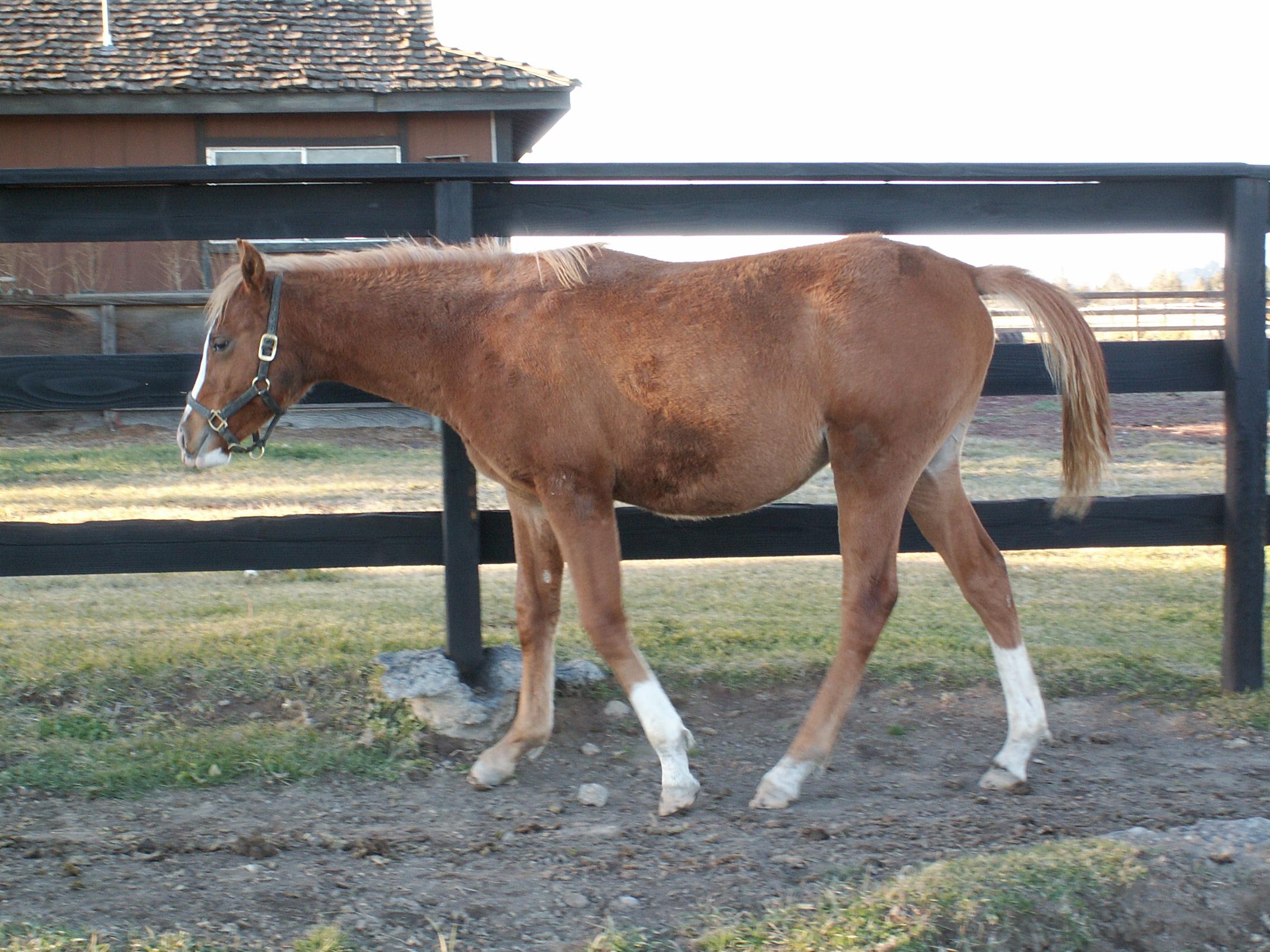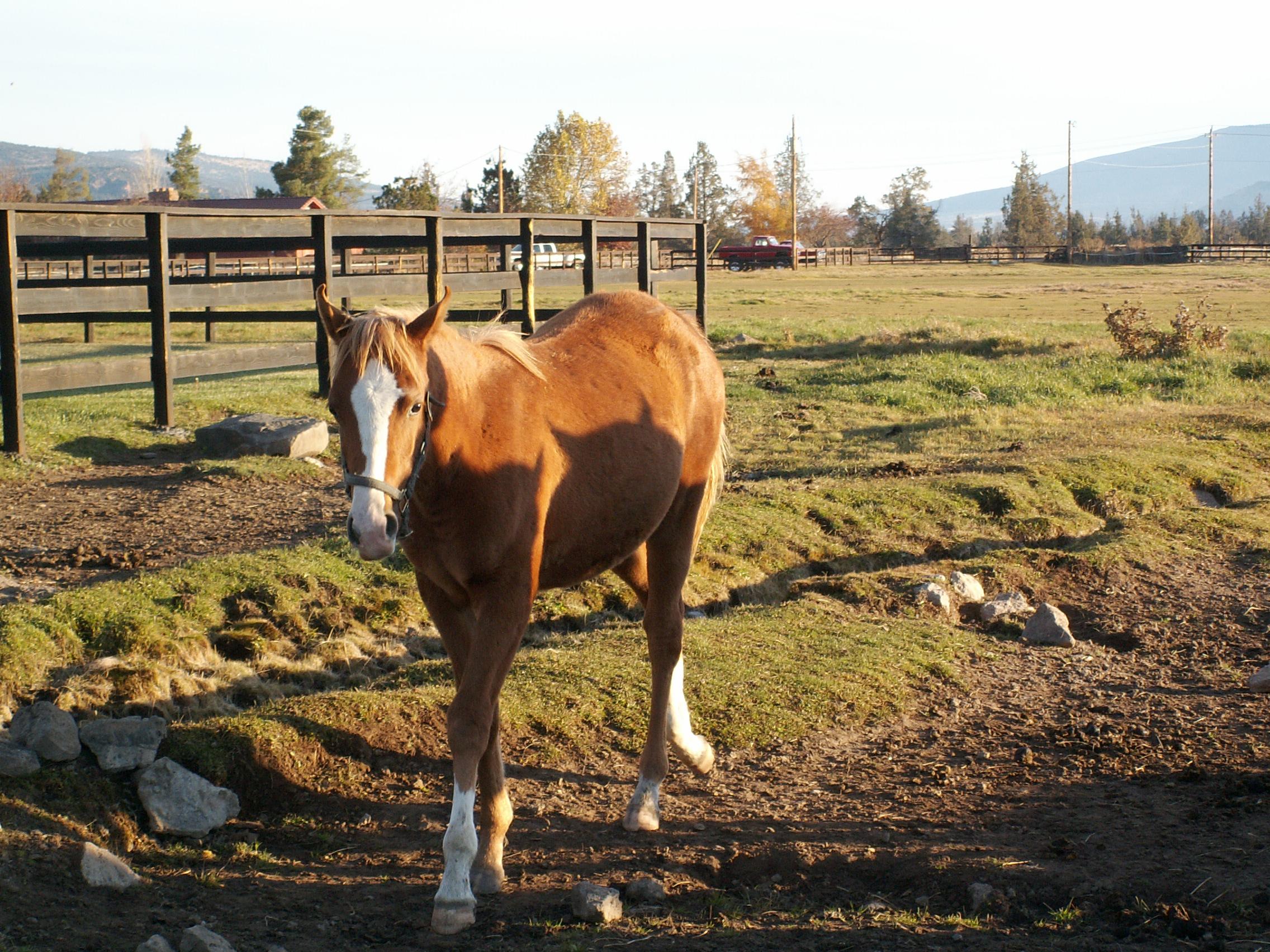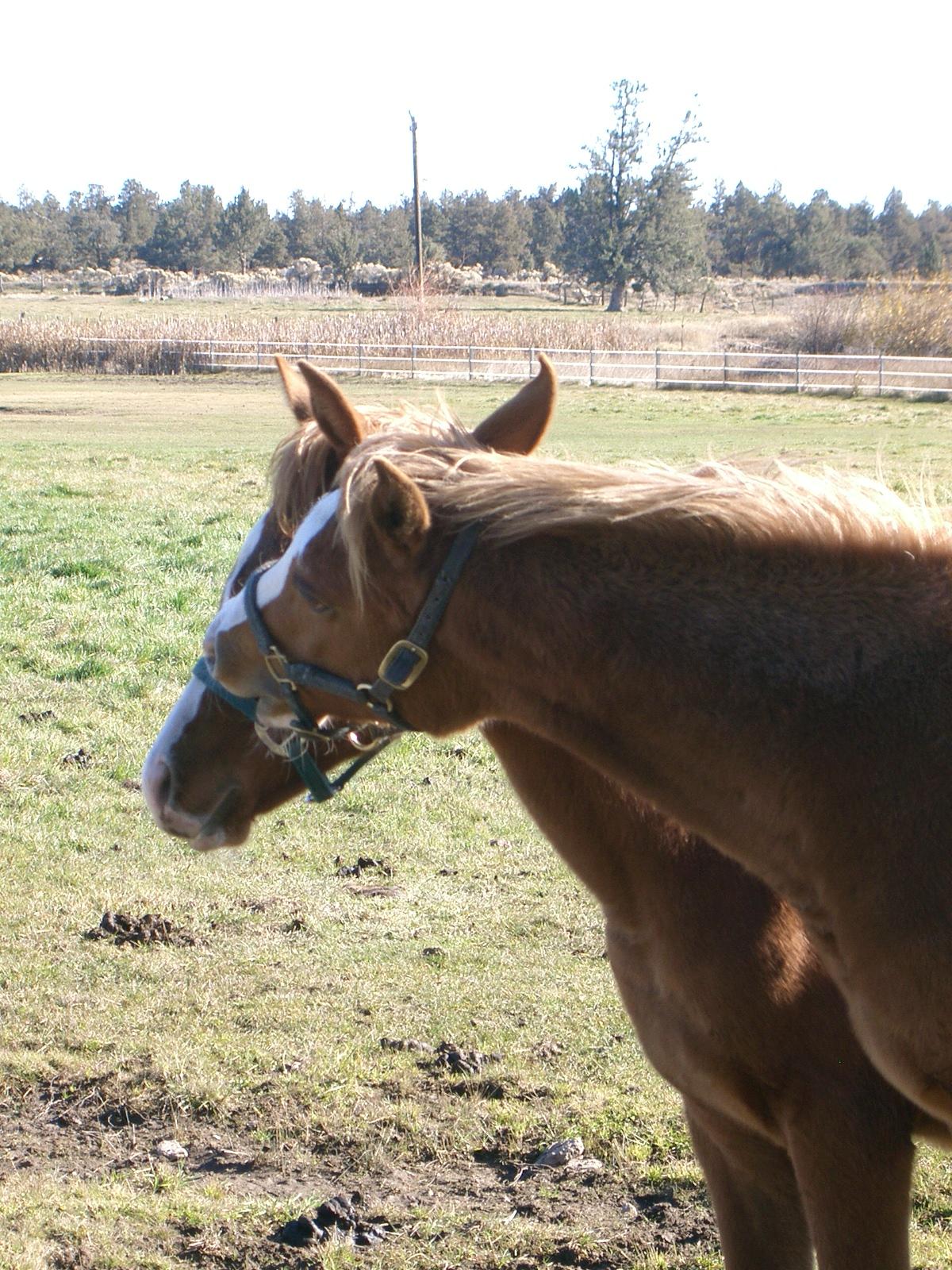 I had talked to Ray Berta about how to approach the first day with my new baby. He said I should spend as much time with her as possible and "make her want to be with me." I think he didn't have in mind that she and I would be in a 10 acre pasture with 5 other 8 month old horses. (Oh yeah, Jien was born on 20 Feb, 2004, so she was about 8 months old when we picked her up.)