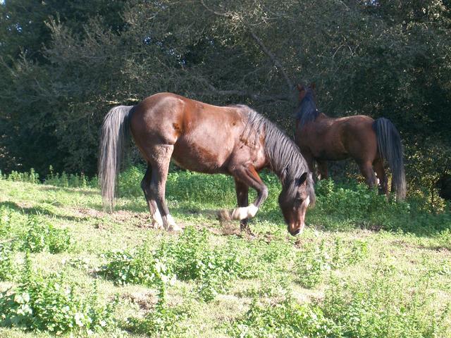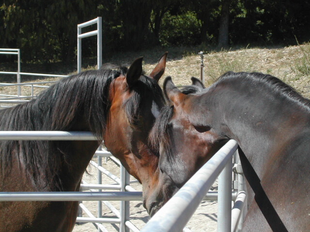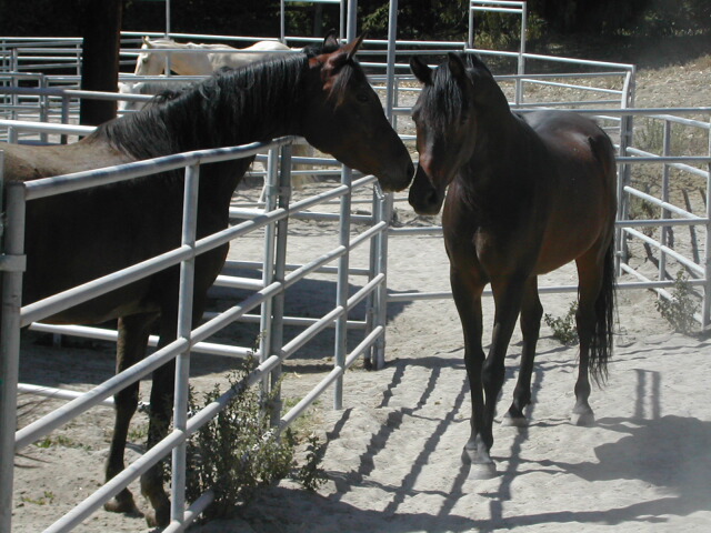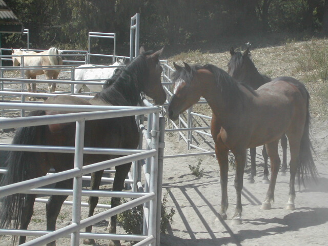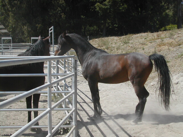 As soon as she got put in her paddock, the Kids had to introduce themselves. First came Nadia, in a cloud of dust. Then came Kharina's prolonged first exposure to Zeph: First he approached and she didn't look at him. Then she looked. Then she allowed him to get close. Then Zeph couldn't stand it anymore and essploded. His Mother *did* teach him manners, he just ignored her like he does everybody else.