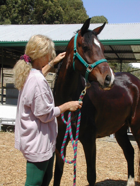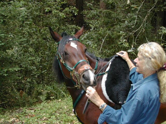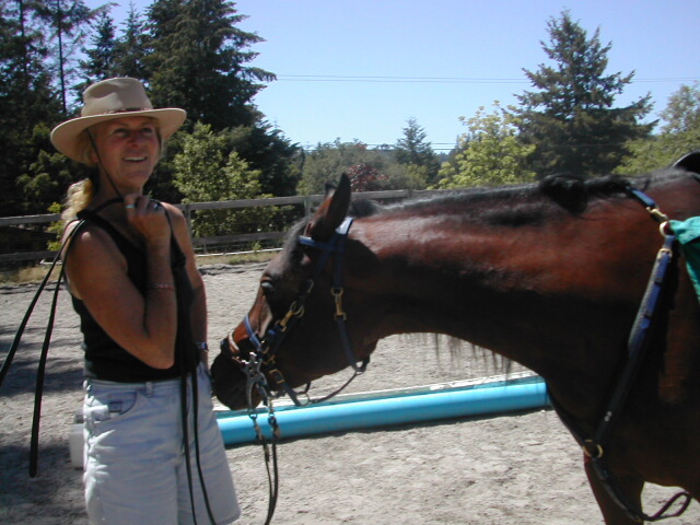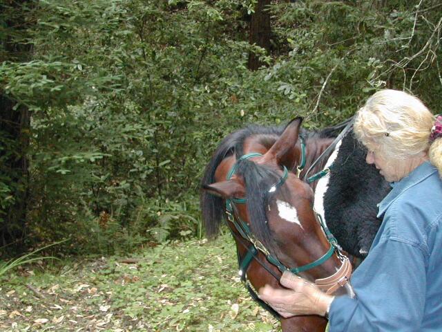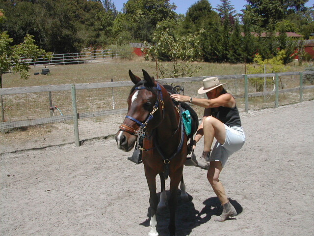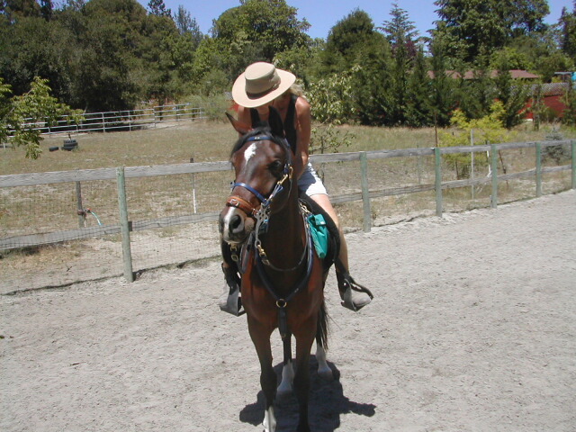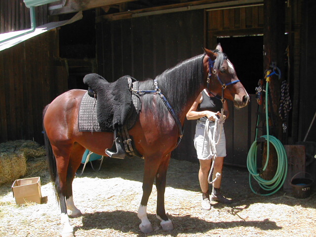 Judy got a new horse for her birthday (June 13) - a four year old Arabian (what else?) mare named Kharina. Kharina's full brother, Tonto, has completed Tevis several times and Kharina looks like she has the right stuff, too.