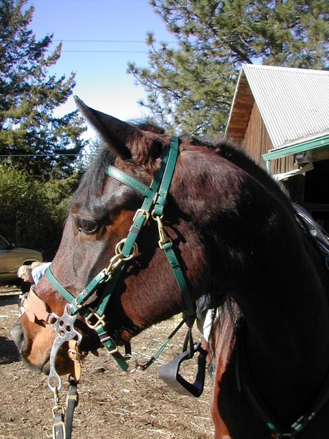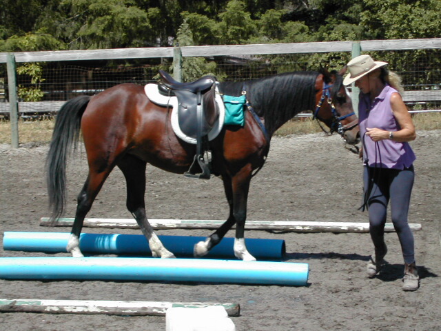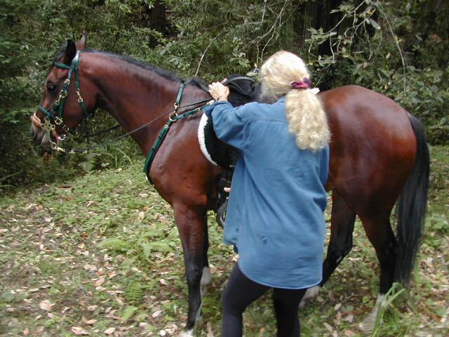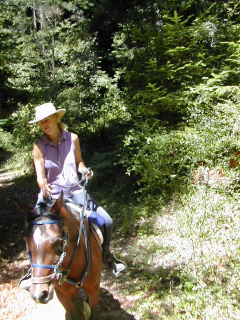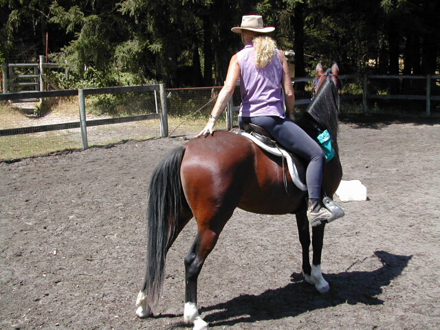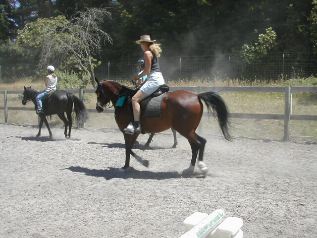 Kharina went out with Tuffy, Ms L, and Al today (22 June). Before we left, Kharina had to do some arena work to put her in the right frame of mind. The first picture is purely for archival purposes: if we ever need to know exactly how big Judy and Kharina's rear ends were on 22 June 2002, we know where to look. The second picture is of Kharina walking between the lines; contrary to the way the picture looks, she is NOT walking on top of the pipe. Finally, an over-the-shoulder shot of Judy and Kharina on the trail. I kept it in because Wayne said it was a good picture because of the color and you can see Judy's face - and Judy believes everything Wayne says, so . . .