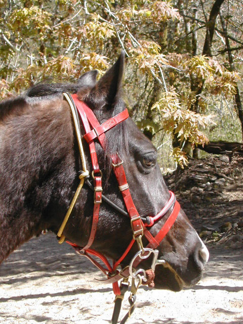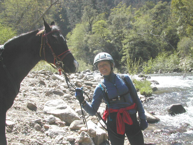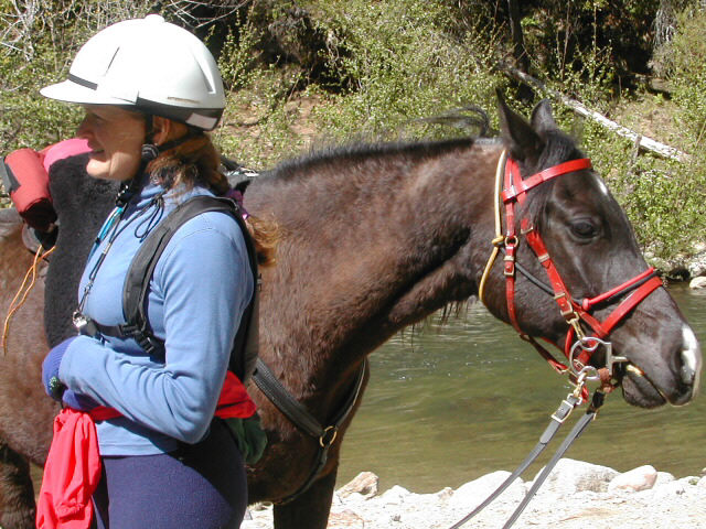 We hustled back up from the river, stopping a couple of times to graze the horses. And, yes, Ali did eat grass. She's a changed mare since she got her bit. The only mishap was that Debbie forgot Alex's hopping protocol at the utility ports and got dumped pretty near the top of UC. We dusted her off, threw her back on Alex and took off again. We stopped at Twin Gates to compose ourselves. |