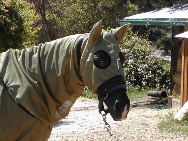 The fly season has hit here in Bonny Doon and Tuffy is allergic to them, so his Mom got him a fly suit. Bonnie pointed out that The Tufster looks sort of medieval, with his armor on. Hmmm. It looks to me a lot like the Chemical and Biological Warfare Safe Suits we saw on tv recently - do they know something we don't know?