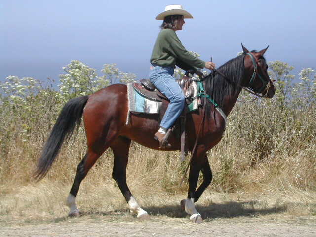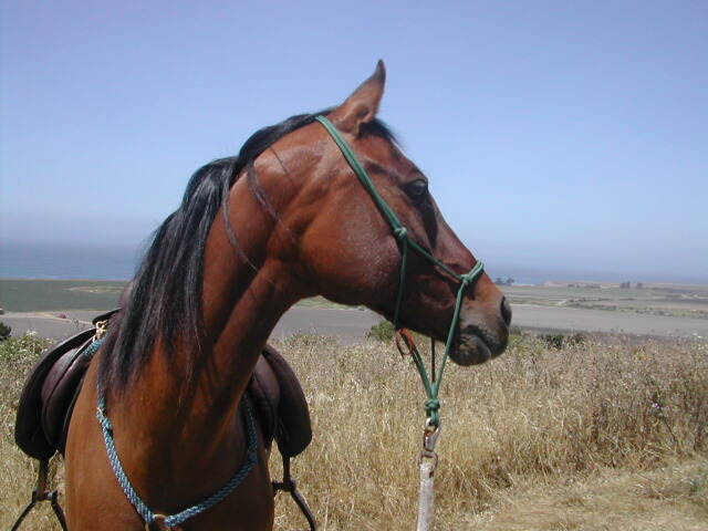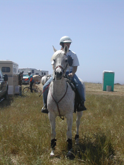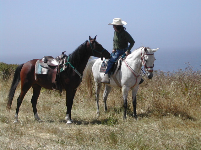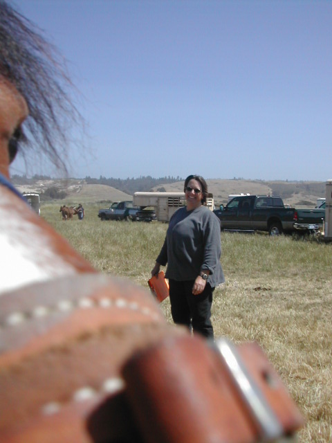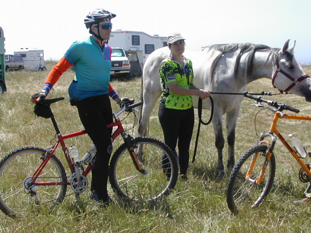 The Carrotfest is an annual event put on by the Santa Cruz Horsemen's Association and the Mountain Bikers of Santa Cruz. Members from both clubs meet at the Horsesmen's camping site on Hwy 1, bringing along their respective steeds, and the bikers work with the horses and horseman to accustom the horses to meeting bikes on the trail. The two main co-conspirators are in the picture above - the organizers from the two participating clubs, and Teddy Bear, the horse.