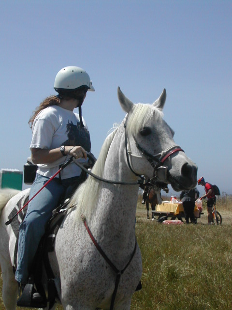 I concentrated on taking pictures of the crowd from the ranch mostly: Cathy and Bow, Trisha and Nabi, Bonnie and Vannie, Judy and Nadia. I also threw in a few pictures of Nancy Twight riding and ponying a little bay mare that is the full sister of her gelding, Tonto, who has completed Tevis several times. My husband was there, too, as a mountain bikers, so there are a couple of pictures of Ali and I, as well. Brave Al and I rode from The Ranch, so the first pictures is our first sighting of our goal. Judy and Nadia rode back to The Ranch with us, and the last picture is proof positive that the plan worked: it's of Nadia holding up a biker on the entrance to Enchanted Loop until he gave her a carrot!