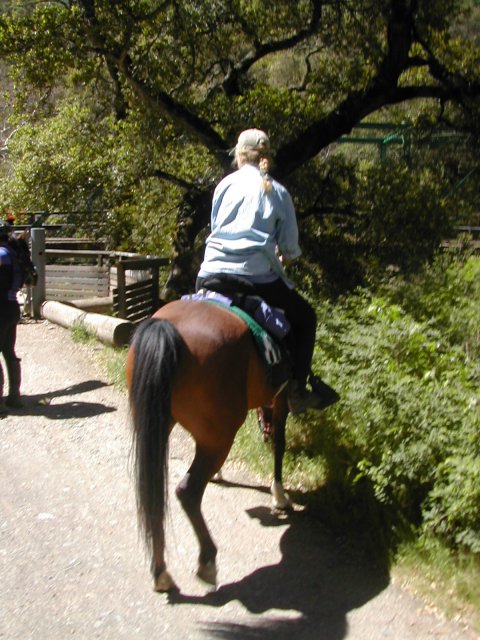 This is our start. Mike and his horse, Mikey, led the way out of the park. To get through the entrance gate at the park, you have to step over three large logs while turning a half circle around the end of the gate (it's to keep bikers from riding through it). You can just see it in the second picture. It was quite a challenge to the less experienced horses; Mikey and Nadia both are just out of school and were pretty flummoxed by the whole idea. However, they both were eager learners. We stopped to adjust girths, etc. just a little while later and Nadia gave one last look toward the trailer before heading seriously up hill.