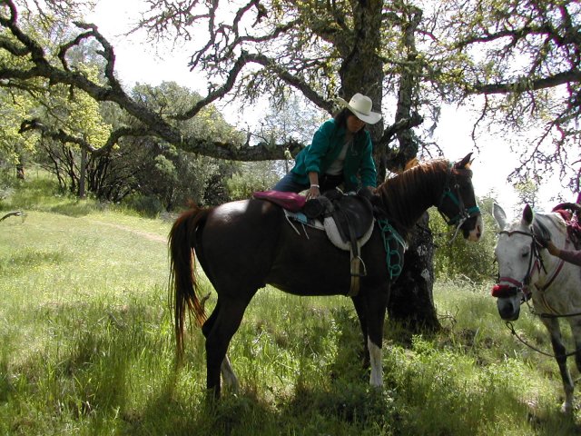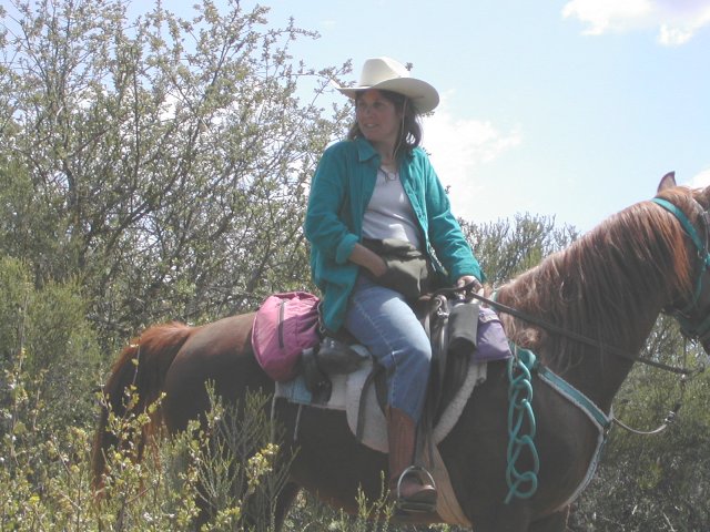 We followed the stream for quite a while, then broke off and started our long singletrack climb to the ridgetop. Half way up, we found a picturesque and almost flat place to give the horses a breather and grab a bite of lunch for ourselves. It wasn't too long before Nancy mounted up, though, and got us dogies rollin'.