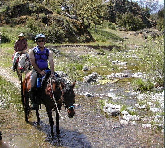 After quite awhile on the single track, we emerged into a valley with a river running through it. It was very beautiful as it unfolded from behind Judy's shirt. All the horses took the opportunity to drink and Nancy's horse, Tonto, looked like he was contemplating rolling, too.