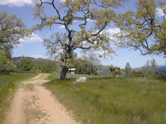 The fire road ended when we got to the ridge top and saw what has to be the outhouse with the best view in Central California - it's the little white building in the distance. When we got there, we headed down some seriously single singletrack.